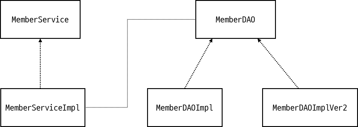 MemberDAOImpl 혹은 MemberDAOImplVer2 둘중 하나를 넣어주어야 한다. 이 역시 위의 xml 파일에서와 같이 정의를 해주어야 한다. 이는 <constructor-arg> 태그와 <ref bean="memberDAO" /> 를 사용한다. 이 방식을 통해서 스프링 컨테이너를 통해서 MemberDAO의 구현체를 주입한다 이를 DI 라는 표현을 사용해서 표현한다.