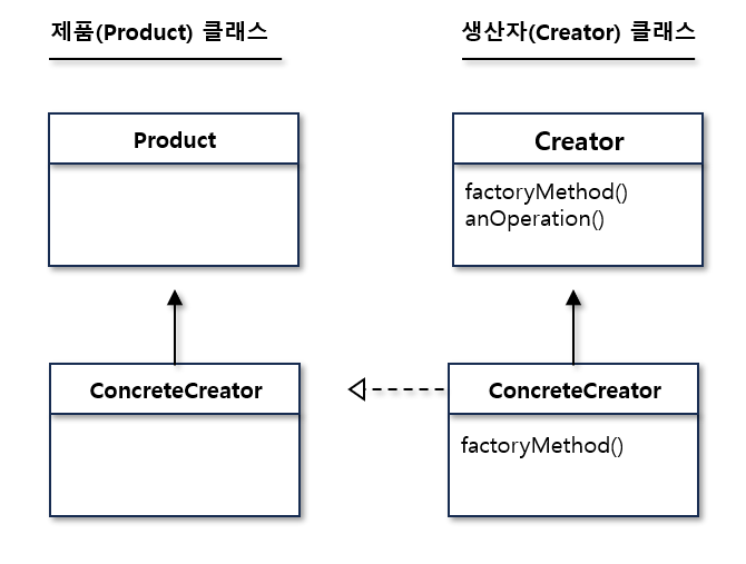 팩토리 메서드 패턴에서는 어떤 클래스의 인스턴스를 만들지는 서브클래스에서 결정합니다. 해당 패턴을 사용하면 클래스의 인스턴스를 만드는 일은 서브클래스에게 맡기게 됩니다. 여기서 "결정한다"라는 표현을 쓴 이유를 좀 더 정확하게 풀어서 설명하자면 사용하는 ConcreteCreator에 따라서 생산되는 객체 인스턴스가 결정되기 때문입니다. 추가로 Creator에서는 추상 클래스 및 추상 메서드를 사용한 예시를 보였으나 간단한 구상 제품의 경우 Creator의 서브클래스 없이 팩토리 메서드 패턴을 정의할 수 있습니다.