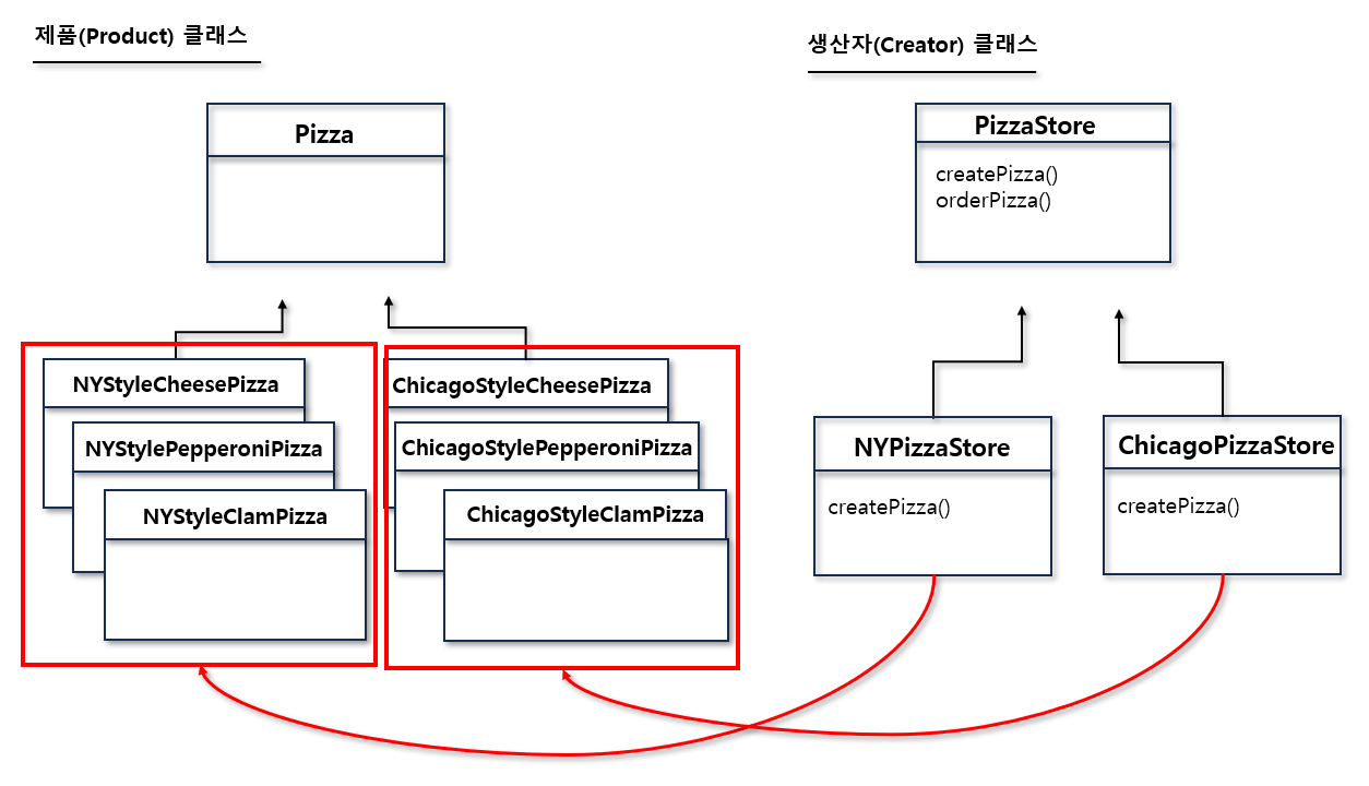하지만, 간단한 팩토리를 적용한 코드에는 문제점이 있습니다. 객체 마을의 피자가게가 인기를 끌면서 여러 지점을 낼 때가 온거죠 지점을 낼 때는 그 지역의 입맛과 스타일을 반영한 피자를 만들어야 합니다. 피자에는 뉴욕스타일의 피자, 시카고 스타일의 피자가 있듯 말이죠. 코드로 살펴본다면 아래와 같습니다.