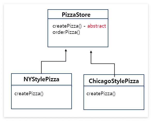 위와 같은 코드 스타일이면 지점에서 만든 팩토리로 피자를 만들긴 하겠지만 지점마다 피자를 만드는 방식이 달라질 수도 있을 것입니다. 따라서 지점을 관리할 필요가 생긴거죠. 조금 더 쉽게 말하면 지점들마다 피자 제작과 관련된 기능을 하나로 묶는 기능이 필요합니다. 이는 지점들 마다 PizzaStore라는 추상 클래스를 상속하면서 관리할 수 있을 것입니다.