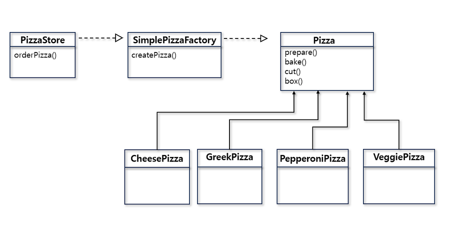 우리는 여기서 객체 생성을 처리하는 클래스 (SimplePizzaFactory)를 팩토리라고 부릅니다. 용어는 팩토리이지만 아직 팩토리 메서드 패턴이라고 볼 수는 없습니다. 위와 같은 방식을 간단한 팩토리 방식이라고 하겠습니다. 위 코드에서는 Pizza의 종류가 변경이 되거나, 추가가 되더라도 PizzaStore 에서는 코드를 고칠 필요가 없습니다. 피자 객체 생성을 전담하는 팩토리 클래스만 변경하면 되는거죠. 어쨌든 코드 변경은 똑같은 거 아니냐고 생각하실 수도 있는데요.. 생각해 보면 변경이 일어날 수 있는 부분을 캡슐화해놓음으로써 코드를 여기저기 수정할 필요 없이 한 클래스에서 수정만 해주면 되는 거죠.지금까지 구현한 코드를 다이어그램으로 살펴보면 아래와 같습니다.